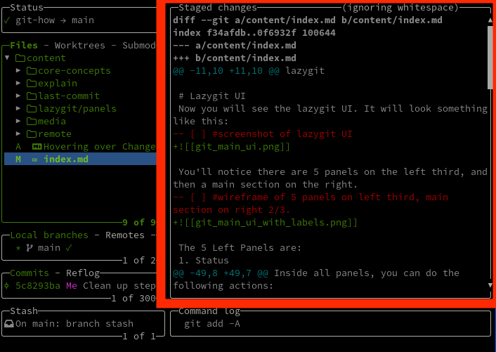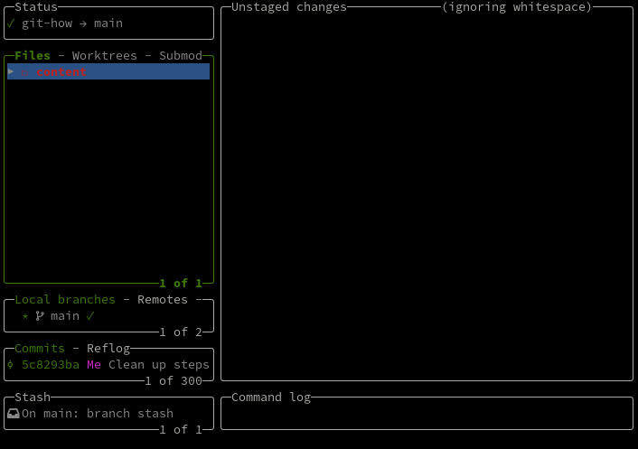 - For the rest of the tasks in lazygit, don’t make a concerted effort to memorize them. Just keep a tab open to this site, and look up stuff as needed. Do them enough times, and you’ll naturally develop muscle memory for them. After a while, you’ll find yourself using lazygit for more and more tasks, and you’ll find yourself looking up stuff less and less.
