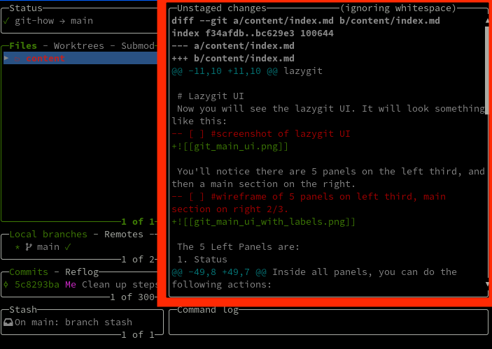 If the file is unstaged, then the main section will show one panel “Unstaged changes” with a diff of what you have changed since your last commit.